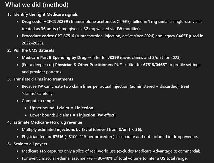 Let´s add more obscureity! As I teased before, Xipere was approved in 2021. As I understand it, it is basically a corticosteroid to treat Uveitic Macular Edema, but injected using the SCS Microinjector. So the underlying drug is not really novel, which is probably one reason for sales that are - so much we do know - for sure no blockbuster. This also is like a 150-300 million US$ market according to ChatGPT, it estimates that Ozurdex from ABBV does about 90-100 mln US$ in Uveitis worldwide.