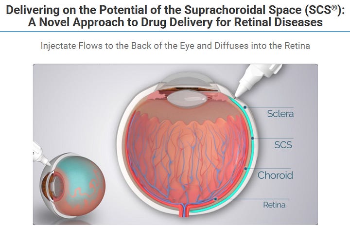 Now I don´t know if Clearside´s therapy is as competitive as they show. But there is clearly demand for “less eye-poking” and Clearside could not only provide less poking in general (vs Eylea/Vabysmo), but suprachoroidal-micro-poking instead of needle-through-your-eyeball-poking. This might sound extremely superficial (because it is) but I also think it makes a bit of sense?