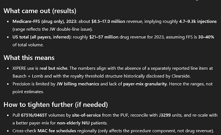 So maybe there are some additional rebates or methodological weaknesses the AI is overlooking, but the treatment is obviously used? Even if Xipere does only 30-40 million US$ in the long-term, Clearside receives “high teens to 20%” of royalties or probably 15-16% net of the 1% they have to pay.